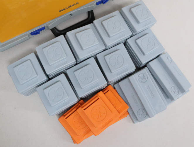 De KlikCaps Medium Compleet bevat 40 stuks enkele KlikCaps, 5 dubbele KlikCaps en 5 enkele KlikCaps met deksel. Voldoende voor één etage. De KlikCaps van dit item worden los verkocht.